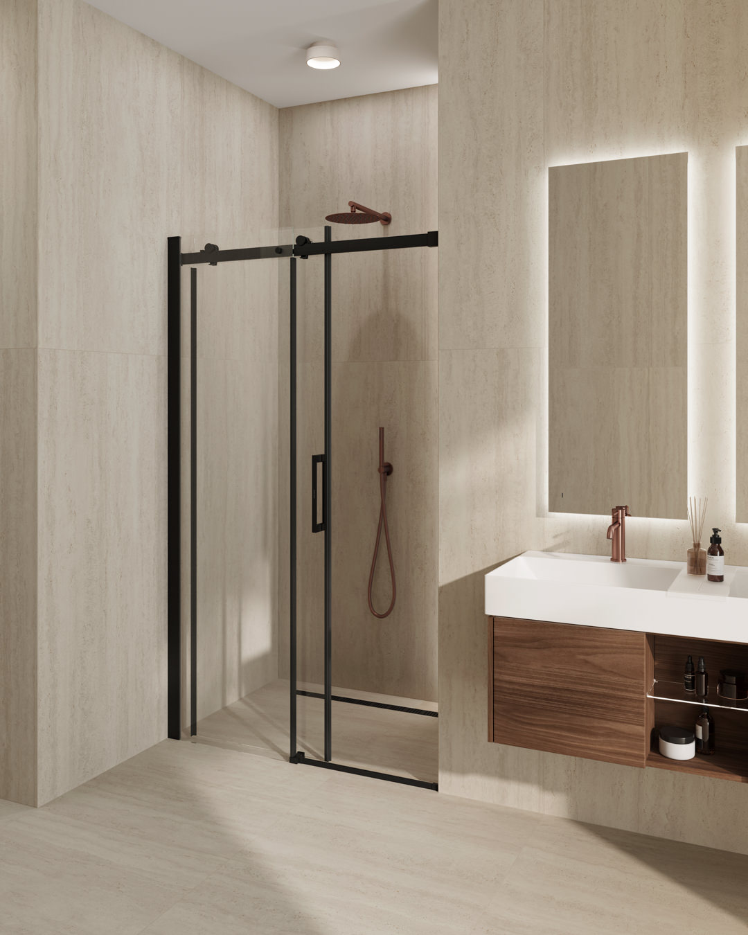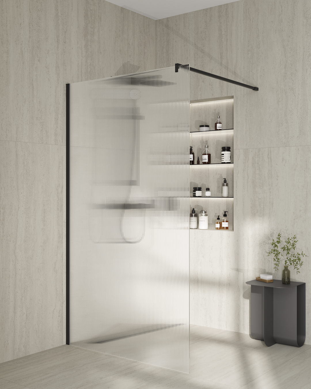 Все стёкла выполнены с антиизвестковым напылением, их толщина составляет 8 мм. Для зоны Walk-in предусмотрено эксклюзивное рифлёное стекло, отличающееся кристальной прозрачностью.
