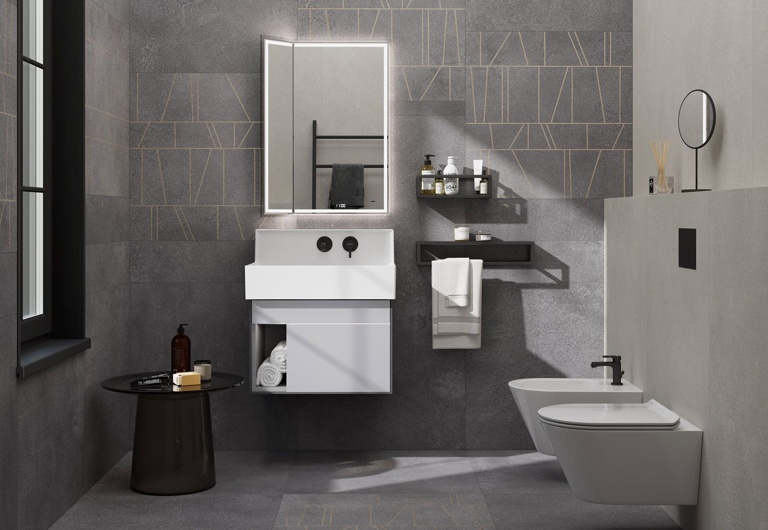 Комплект «Текнолоджика М» готов стать ключевым элементом ванной комнаты, объединив в себе функциональность, запоминающийся облик и яркие инновации. При ширине 65 см это решение содержит всё необходимое для повседневной заботы о красоте и здоровье. Комплект, состоящий из зеркала, тумбы и раковины со встроенным смесителем, предлагает особый потребительский опыт — и напоминает о том, что пришло время менять ежедневные привычки к лучшему.